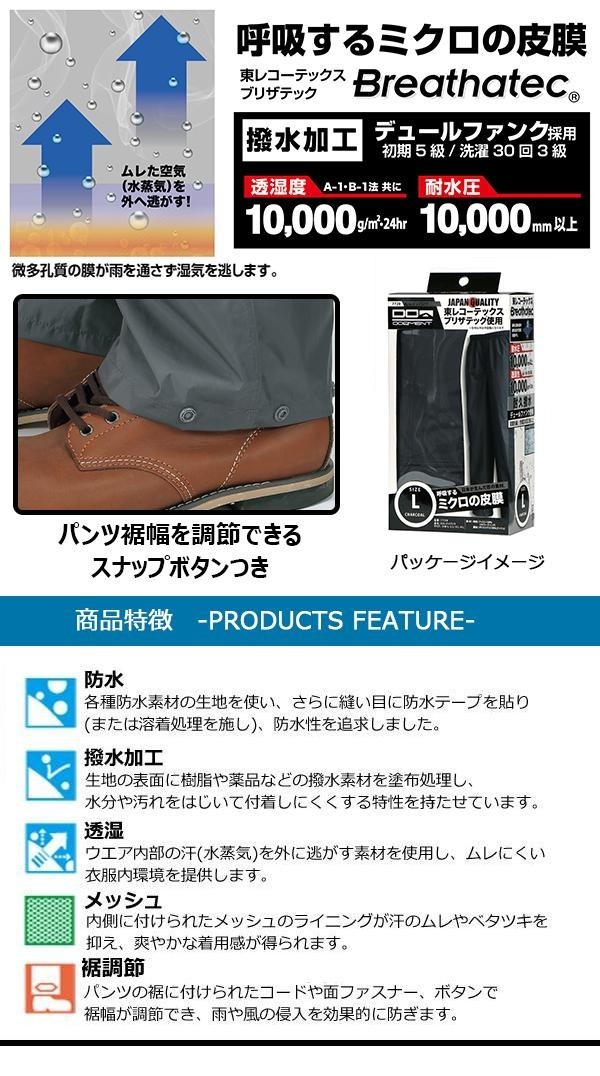 東レコーテックスの透湿防水素材「ブリザテック(R)」を使用した高性能レインパンツ!!ムレた空気(水蒸気)を外に逃がし、快適な着心地を実現!! |