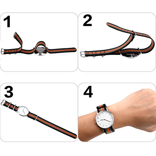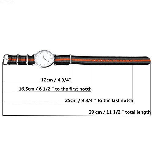 -. Feature : Replace in seconds: No need to remove spring bars! Buy multiple color and replace your watch band in seconds to fits your mood and outfits in daily life. / Prime Material: Perfect ballistic nylon and matte-brushed stainless steel make this watch band a great quality. It is durable and comfortable to wear. / Size: This watch band can perfeclt fits most watch with width of 22 mm. It's approximately 10 1/2"inches long excluding the buckle. Fits wrists from 6" to 8 1/2" / Strong Adaptability: Adebena nylon watch strap is a stylish, soft and breathable watch accessory which can be used either in wet or hot weather. You can enjoy yourself with no concern while doing fitness, swimming, diving, or climbing. / Advanced production craft: Laser cut to eliminate fraying; Ultrasonic welding combines two pieces of nylon into one homogenous piece. Say no to glue and cheap stitching. Stink resistant, waterproof machine washable.