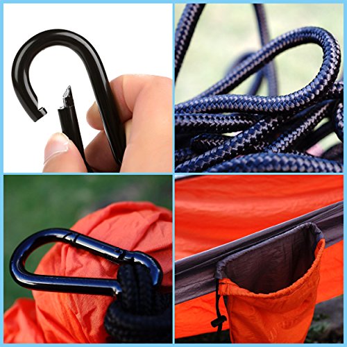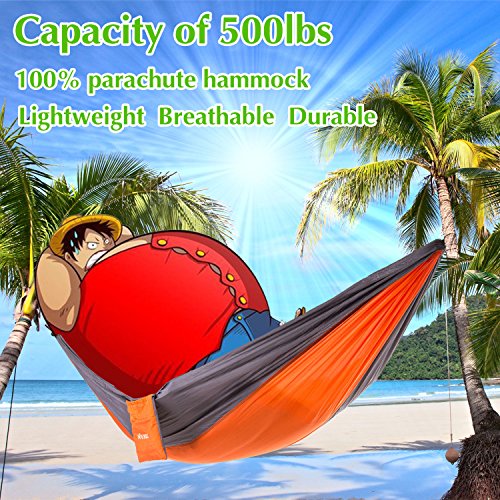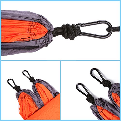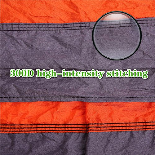 TOP QUALITY: our camping hammock use new 210T nylon parachute fabric,300D high-intensity stitching,Comfortably supporting up to 500 lbs. 210T is the strongest nylon fabric, also is light, quick drying, top strong, mildew resistant, machine washable, and so silky soft and comfortable