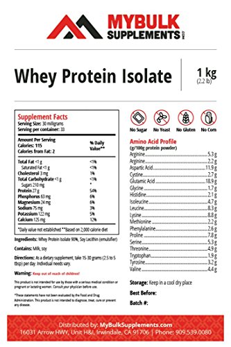 Product DescriptionMyBulkSupplements - Whey Protein Isolate Unflavored Verified Pure 90% Isolate (1 kg / 2.20 lb / 35.3 oz)0
