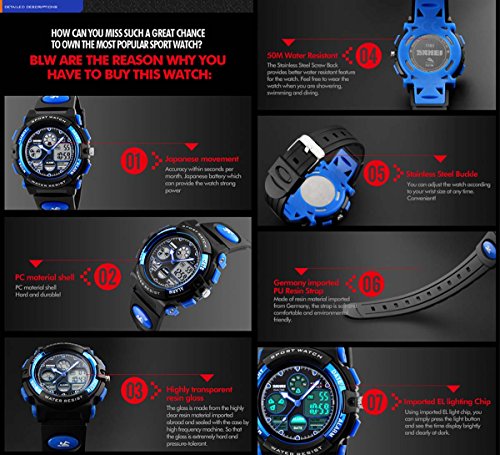 Multi-function: Auto Date, Dual Time, Alarm, Water Resistant, Stopwatch, LED display, Shock Resistant, Back Light