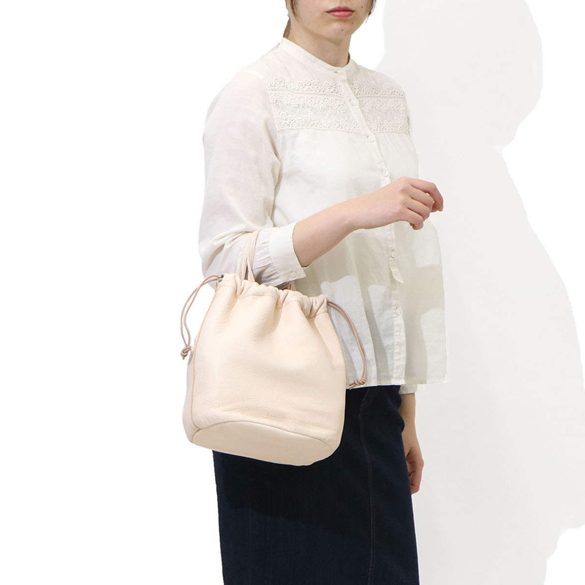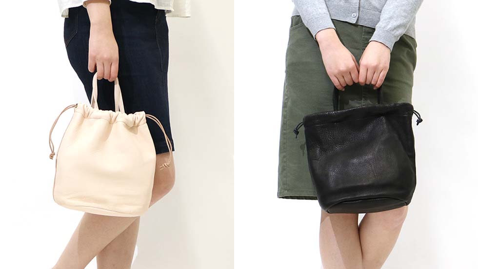 昔ながらの仕事の道具から着想を得てデザインされた「DEER」シリーズ。どこか素朴でナチュラルな雰囲気があり、収納口の巾着部分は絞って持っても、あえて絞らずに持ってもスタイルにラフに馴染む小型バッグです。