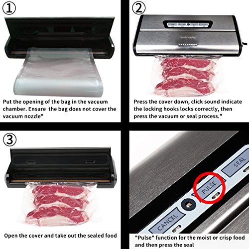 Advanced Designs and Accessories Included # 1.Easy-to-clean but durable stainless metal case 2.Intelligent LED indicator lights 3.Flexible manual pulse function; Starter Kit includes: 5x 22*30cm Heat-Sealed Bags, 5x 22*10cm Heat-Sealed Bags.