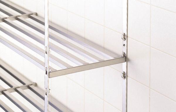 | 棚がスライドしますので空間のムダなくスッキリ取付けできます。パイプ、パイプ受け、枠の全てがサビや汚れに強い18-8ステンレスを使用。 |