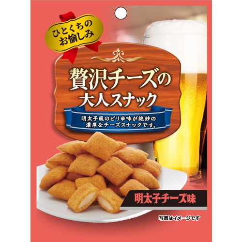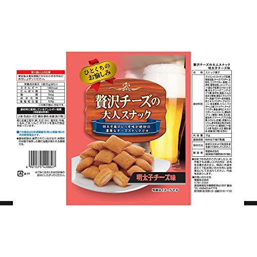 原材料:チョコレートング(乳糖、植物油脂、チーズパウダー、全粉乳、ココアバター、食塩)、小麦粉、植物油脂、コーングリッツ(遺伝子組換えでない)、砂糖、明太子シーズニング(ぶどう糖、香辛料、食塩、たん白加水分解物、酵母エキスパウダー、魚醤パウダー、粉末醤油、肉エキスパウダー、デキストリン、粉末鰹節、たらこパウダー)、小麦ファイバー、チーズパウダー、食塩、酵母エキスパウダー/トレハロース、調味料(アミノ酸等)、香料、乳化剤、着色料(アナトー、パプリカ色素、カラメル、紅麹)、炭酸カルシウム、香辛料抽出物、甘味料(スクラロース)、酸味料(一部に小麦・乳成分・大豆・鶏肉・豚肉・魚醤(魚介類)を含む)