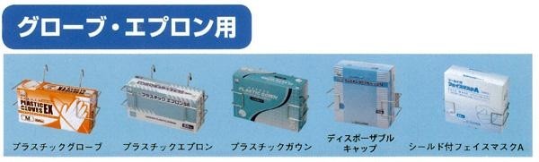 グローブ・エプロン用のホルダーです。ハクゾウの「プラスチックグローブ」「プラスチックエプロン」「プラスチックガウン」「ディスポーザブルキャップ」「シールド付フェイスマスクA」をセットすることができます。ホルダー設置により、作業効率がアップし業務の改善につながります。 |