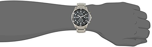 - Feature : Chronograph watch featuring round black dial with date window at 3 o'clock and two subdials / 45 mm stainless steel case with glass dial window / Quartz movement with analog display / Stainless steel band with deployant-buckle closure / Water resistant to 100 m (330 ft)