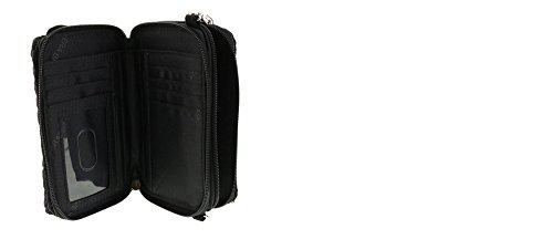 Two main zippered compartments: The first compartment features 6 card slots, 1 clear ID slot, 4 slip pockets, and 1 bill fold pocket