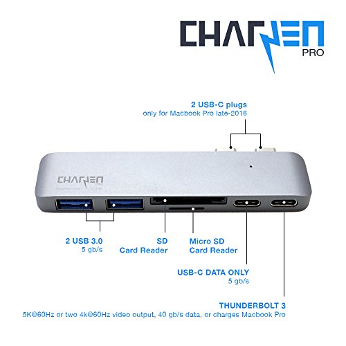 PORTS GALORE: One USB-C THUNDERBOLT 3 port: Run TWO 4K@60Hz video output or ONE 5K@60Hz or just charge your Macbook Pro. ONE DATA USB-C port for ***JUST FOR DATA ONLY*** (no video output, no charging), Two USB 3.0 (5Gbps), SD Card Reader, Micro SD Card Reader