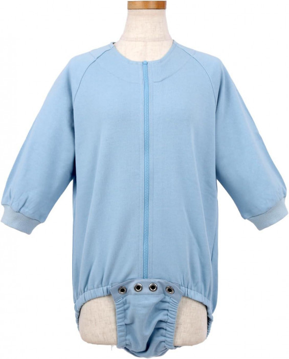 | 胸元から下へ向かってファスナーを締める構造です。ファスナーつまみを覆うアイデアホックを股部分に配置。普段着としてご使用いただける素材とデザイン。動きやすい五分袖です。 |