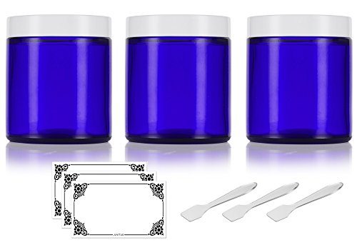 Includes 3- 4 oz Cobalt Blue Thick Glass Straight Sided Jar with White Smooth Lids + 3 Spatulas & 3 Labels