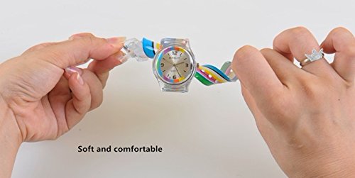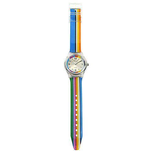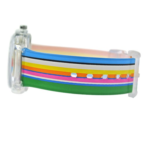 - Feature : Imported / 33 mm plastic case with glass dial window / Japanese quartz movement with analog display / Kids favorite rainbow, high-grade silicon rubber strap / Water Resistant to 99 feet: withstands rain and splashes of water, but not showering or submersion