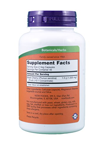 -. Binding : Health and Beauty -. Brand : NOW Foods -. EAN : 0733739046307 -. Feature : NOW (Natural-Organic-Wholesome) has been manufacturing quality natural supplements for over 35 years. / Great way to get the benefits of cherries without all the sugar. / Easy-to-swallow vegetarian capsules -. IsAdultProduct : 0 -. Label : NOW Foods -. LegalDisclaimer : PLEASE NOTE: Product image is representative of the product offered but may not have the exact attributes. Please read product description for the specific attributes of this product. The information above is intended for reference only. While we attempt to keep our information accurate, we cannot guarantee it is an accurate representation of the latest formulation of the product. If you have any concerns, please visit the vendor's web site. The information above are the views of the product's manufacturer, not the views of Nutrition Supply Company. -. Manufacturer : NOW Foods -. MPN : 4630 -. PackageQuantity : 90 -. PartNumber : 4630 -. ProductGroup : Health and Beauty -. ProductTypeName : HEALTH_PERSONAL_CARE -. Publisher : NOW Foods -. Studio : NOW Foods -. Title : Now Foods Black Cherry 750 Milligrams, 90 Vcaps -. UPC : 733739046307