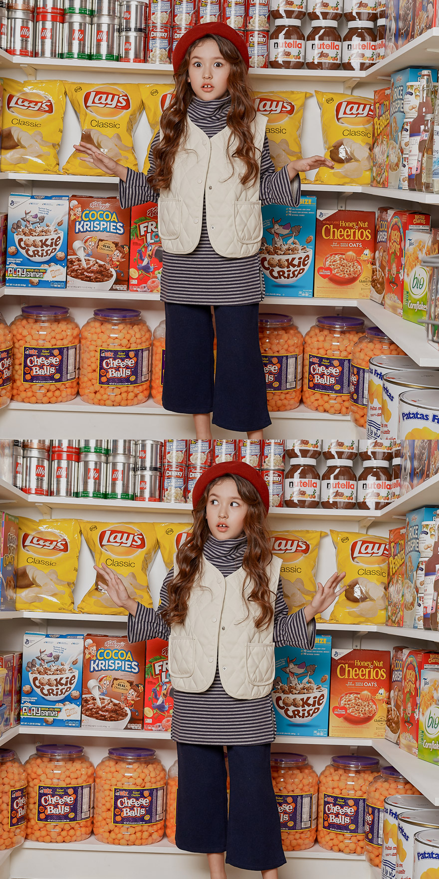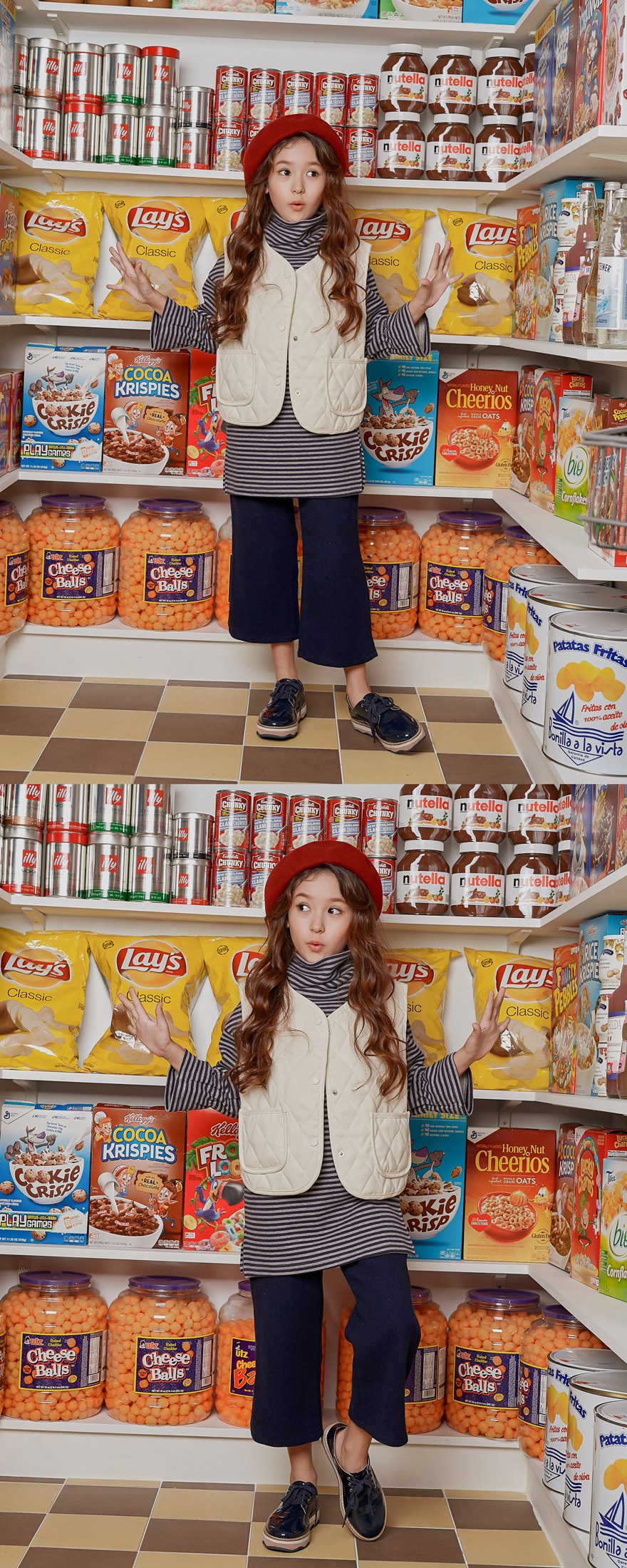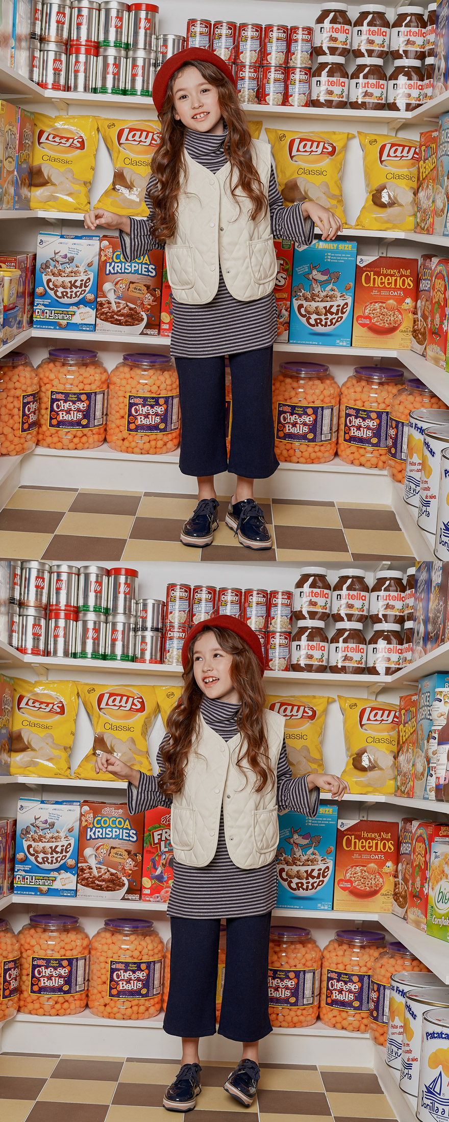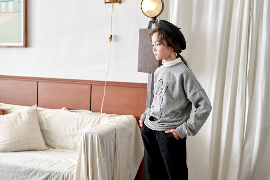 9, 11, 13, 15, 17호로 준비되어 있으며 하단에 측정된 사이즈 표를 참고해 주세요. 올리비안은 128cm에 20kg으로 다소 마른 체격이며, 딱 맞게 네이비 9호를 착용하였고, 엘리는 140cm에 31kg으로 다소 마른 체격이며, 딱 맞게 블랙 11호를 착용하였습니다. 깔끔한 핏으로 잘 맞네요 :)