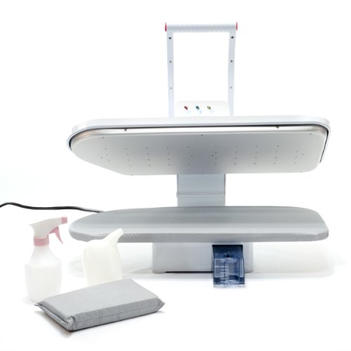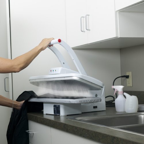 - Feature : Tabletop steam press for quick pressing from Steam Fast; adjustable temperature settings for different fabrics / Die-cast aluminum base; provides 7 times surface area of conventional iron / 1300-watt press automatically shuts off and alerts if left idle for prolonged periods; steam burst buttons on both sides of handle / Tank holds 10 ounces of water; accessories include a spray bottle, washable presser pad, cover, and funnel / Press measures 24 by 22 by 9 inches and weighs 19.8 pounds; limited 1-year warranty. Shipping within the US only