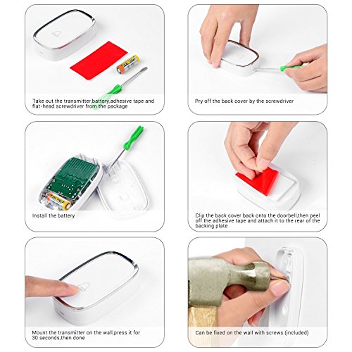 EASY INSTALLATION - No batteries required for receivers, just plug the receivers into an electrical outlet. The 12V 23A battery for the transmitter is included. Push button can be fixed to the door-frame with the attached adhesive tapes or using the screws and anchors included in the package;