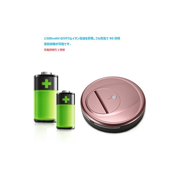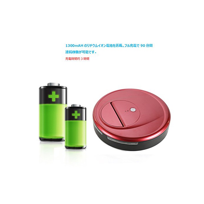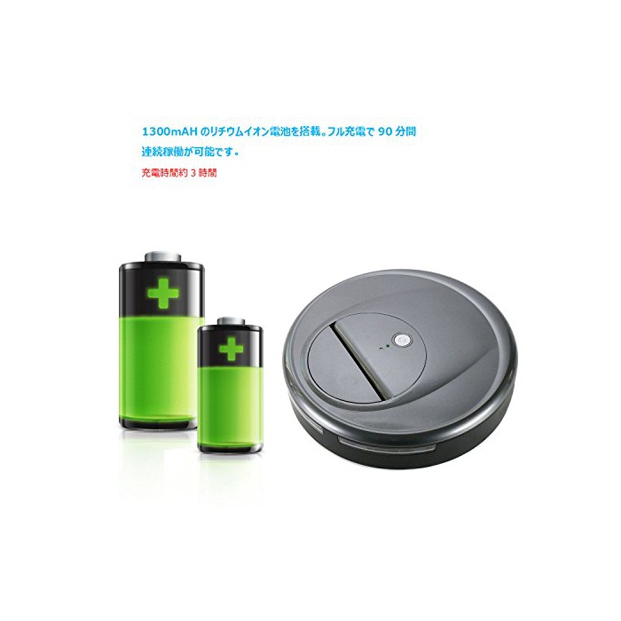 【최대90분의 장시간 청소】1300mAH의 리튬 이온 전지를 탑재.풀 충전으로 90분간 연속 가동이 가능합니다.대형 타입(120평방미터 이상)의 방으로도 사용하실 수 있습니다.