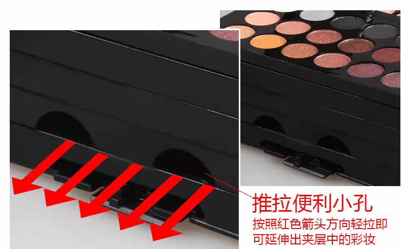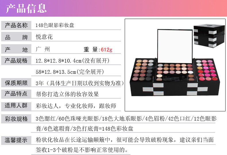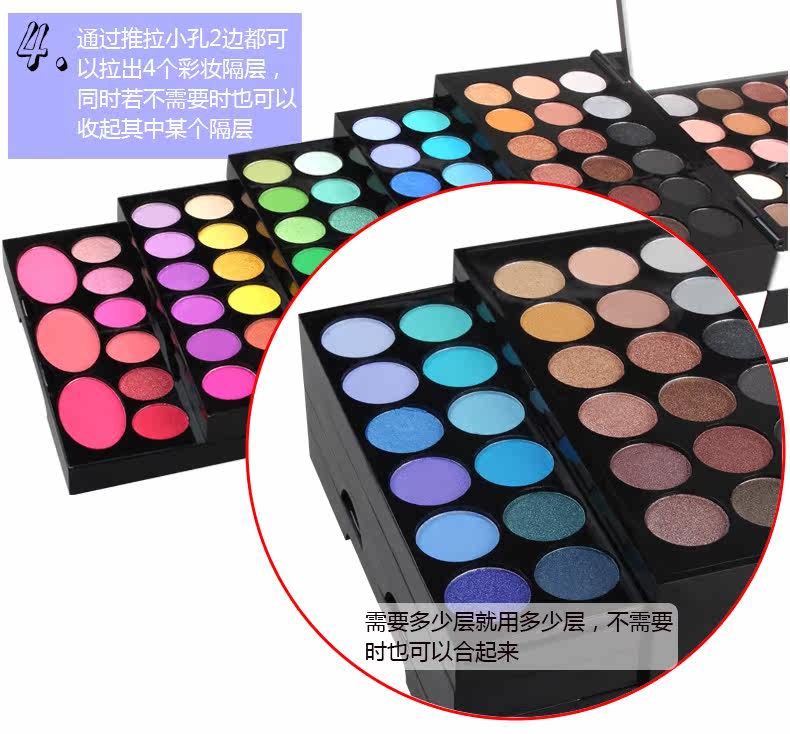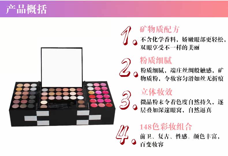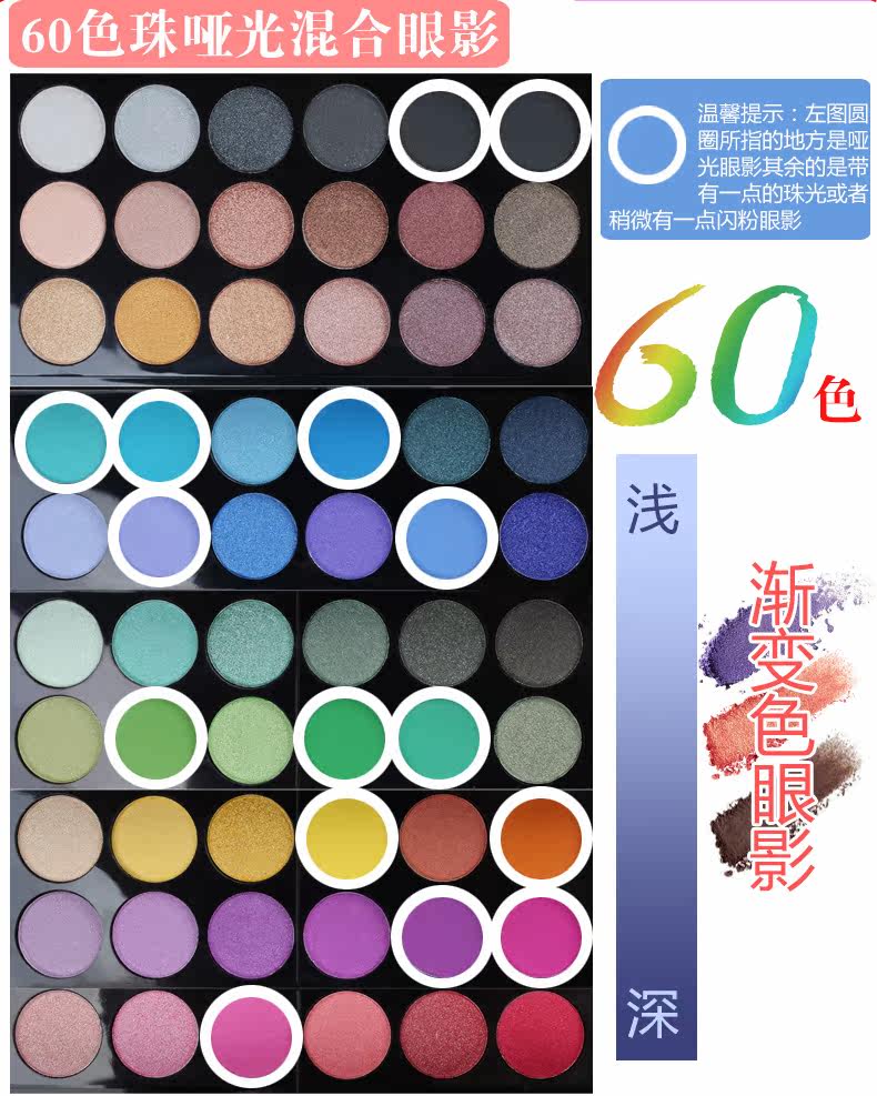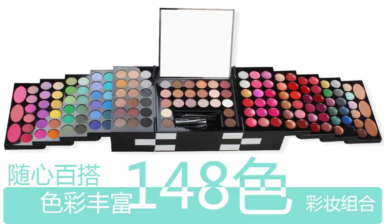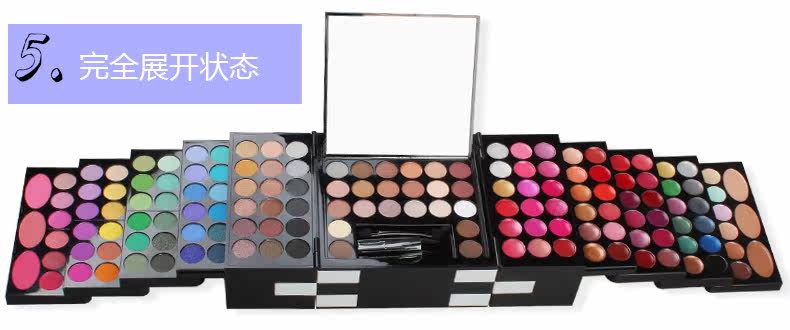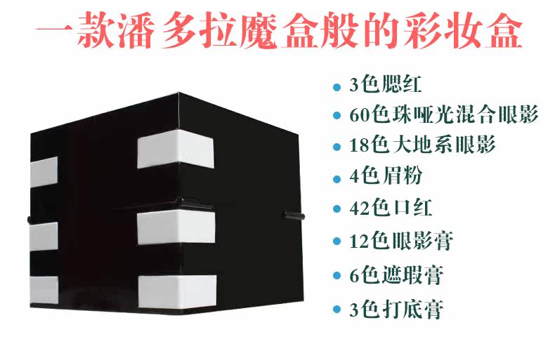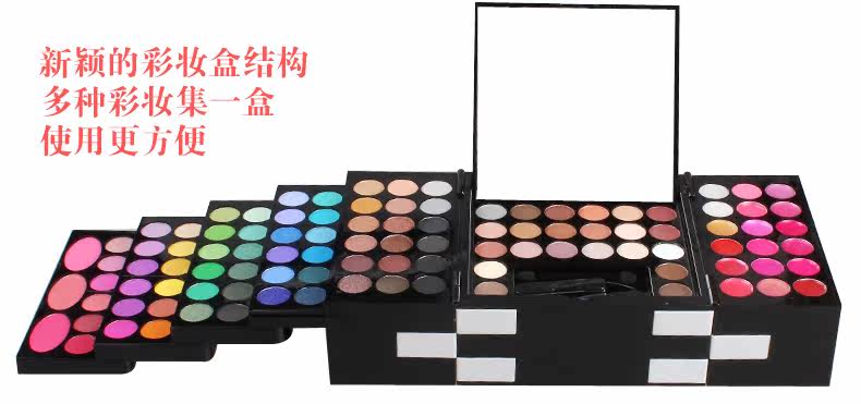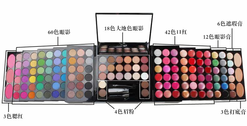 彩妆规格:3色腮红/60色珠哑光眼影/18色大地系眼影/4色眉粉/42色口红/12色眼影膏/6色遮瑕膏/3色打底膏