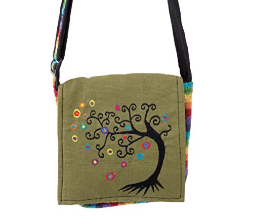Product Description This small cross body handbag is handcrafted in Nepal from 100% Cotton. It has one main compartment with a front flap hook and loop closure. The front flap is dark army green with a multi-colored "Tree of Life" embroidered design. There is one exterior zippered pocket hidden beneath the front flap. This purse is perfect for everyday use. It radiates a casual, bohemian, gypsy style, and the bright rainbow colors match just about anything. 0