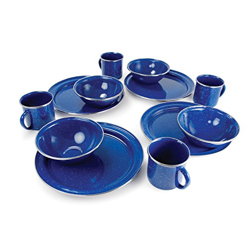 - Four person set blends classic style with beautiful blue porcelained finish and brilliant stainless steel rim