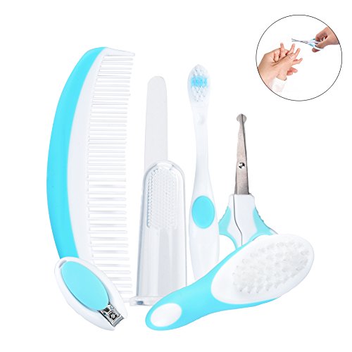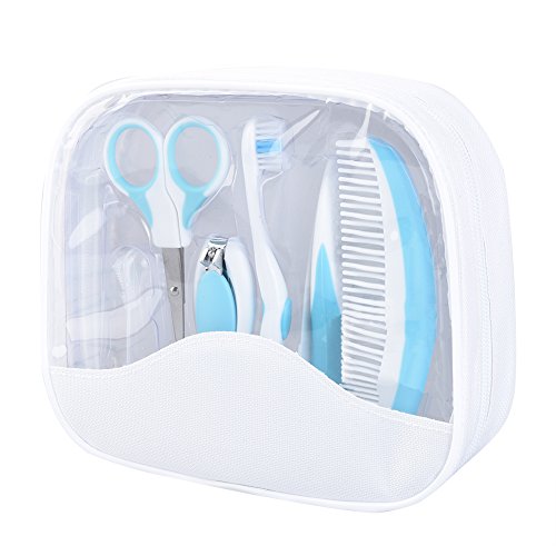 ? Feature Material: ABS stainless steel Size: nail file length 3.9'/10.2cm; width 0.5'/1.3cm; fingertip toothbrush length 2.2'/5.5cm; width 1.1'/2.7cm; nail scissors length 4.2'/10.7cm; width 1.1'/2.7cm; comb length 4.7'/12cm; width 1.6'/4cm; soft hairbrush length 4.7'/12cm; width 1.6'/4cm; toothbrush length 5.4'/13.8cm; width 0.7'/1.7cm; nail clipper length 2.4'/5.9cm; width 1.2'/3.1cm Package size: length 7.5'/19cm; width6.7'/17cm; height 2.4'/6cm Weight: 6oz/170g Color: blue Package list: 1* baby nursery set