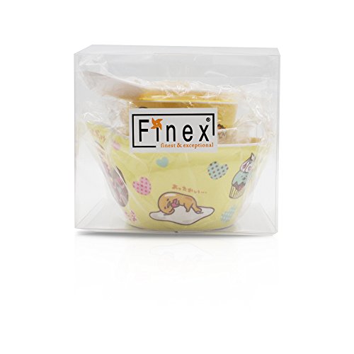 Set of 3 - Yellow & White Gudetama Meal Set - Cup, Spoon, Bowl. Microwave safe; Dishwasher safe (top rack only). Cup Dimension: (Top Diameter) 3.54 in; (Bottom Diameter) 2.36 in; (Height) 3.54 in. Bowl Dimension: (Top Diameter) 5.9 in; (Bottom Diameter) 3.54 in; (Height) 2.76 in. Finex is a registered Trademark. Sold exclusively by Finex Authorized Distributor.Feature