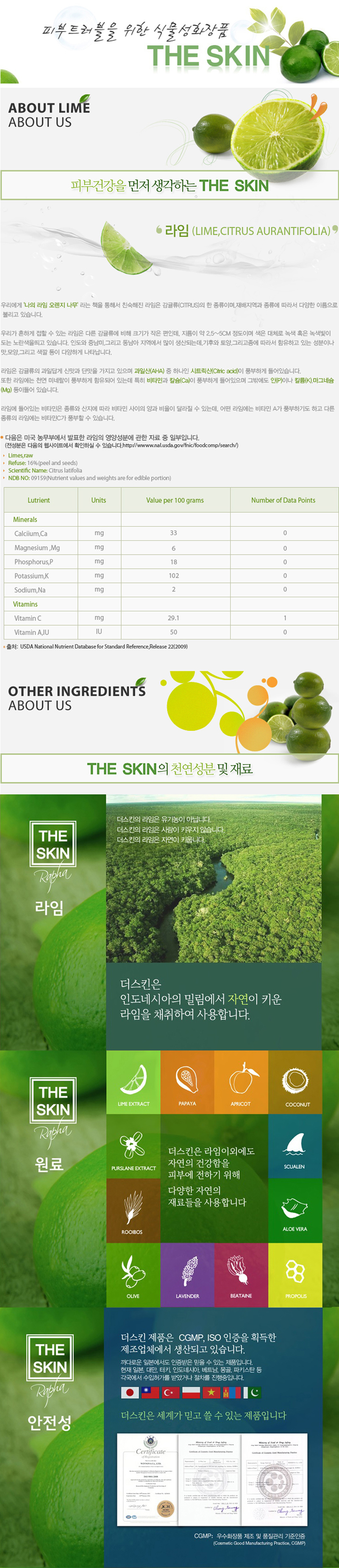 - 주요성분라임추출물, 비타민B1, 스쿠알렌, 비타민C, 토코페놀, 프라보노이드, 알로에베아 잎 추출물, 라벤다오일, 하이루론산