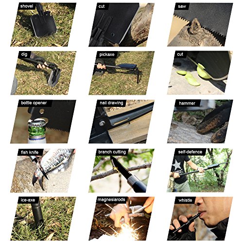 Multi-function:more than 15functions including shoveling,digging,cutting,sawing,exploring,fire starter,bottle opener,emergency whistle, defence etc.Can be used either straight or at a 90 degree angle;