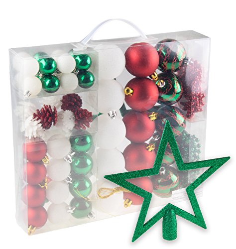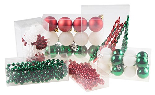 54 Piece Red, White and Green Christmas Ornament Set by Clever Creations | Balls, Pinecones, Icicles, Garland and Topper | Festive Holiday Décor | Lightweight Shatter Resistant | Hangers Included