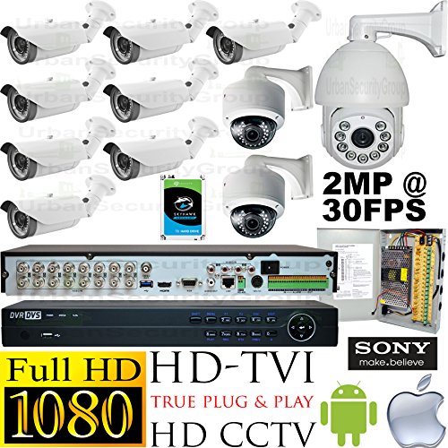 -. Feature : New Release Business Grade High Definition USG Sony Chip PTZ 11 Camera Security System :: 1x 1080P 2MP 4.7-155mm 33x Optical Zoom PTZ with Wall Mount Bracket Speed Dome Camera + 8x Bullet & 2x Dome 1080P 2.8-12mm MOTORIZED Auto-Focus Vari-Focal Lens Cameras With Bracket & Deep Base Mounts + 1x 16 Channel HD-TVI 1080P@30FPS DVR + 1x 4TB HDD + 1x 18 Channel 20A 12V DC CCTV Power Supply *** High Definition Video Surveillance For Your Home or Business / 1080P 2MP = Amazing Quality & Detail = 1920 x 1080 Pixels @ 30 Frames Per Second Live & Record = Same As DVDs Movies Quality! ***** IP66 & NEMA 4x Weatherproof Vandalproof HD Cameras Rated For Outdoor or Indoor Use / PTZ: Pan, Tilt & Motorized Zoom & Auto-Focus 4.7-155mm HD Lens HD-TVI Speed Dome Camera, IR LEDs Array For 400 Feet Nighttime Protection, 360 Degree Rotation, Auto-Flip, Presets ***** Bullet/Dome: MOTORIZED Auto-Focus 2.8-12mm 2MP Lens Cameras, 42x/30x IR LEDs For 130ft/100ft Night Vision ***** UPGRADED PREMIUM INTERNALS: 1/2.8" SONY IMX322 + EN773E ***** Do NOT Be Fooled By Our Chinese Competitors With Inferior Chipsets, Components, Quality Controls & Lackluster Warranties! / 16x Channel 1080P HD-TVI DVR with 4TB Seagate Skyhawk Surveillance HDD: Ultra 4K HDMI + VGA + BNC 1080p HD Video Out, All Channel @ 30 Frames Per Second LIVE & RECORD!! ***** Easy Remote View On Apple & Android Phones + PC Computers Using P2P Cloud Connection or Direct IP Connection ***** Motion Detection, Email Alarm Notification, LINUX Based For Maximum Stability & Security / Kit Also Includes 1x 18 Channel Business Grade CCTV Power Supply Box 20A 12V DC ***** Why HD-TVI? ***** TRUE Plug & Play! ***** 1080P 2MP 1920*1080P @ 30FPS Crystal Clear HD Video! ***** Transmit 1,500 Feet With Coaxial or 700 Feet Over Network Cable With Regular Balun! ***** Does Not Require Complex IP Networking Addressing! ***** Does Not Use Your Network's Bandwidth! ***** LOWEST Price + BEST Value Out Of All Available HD CCTV Technologies!