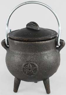 Crafted of cast iron and standing a discrete 3 tall and 2 wide, this squat cauldron rests on three, legs and has small handles set on either side of its 2 diameter rim, through which is looped the metal carrying handle. Coming complete with a lightweight cast iron lid and an embossed image of a Pentagram on both front and back face, it makes a wonderful addition to those who do not have the space on their altar for larger cauldrons or for those who simply wish to decorate their home or desk with this cauldrons small but powerful presence.