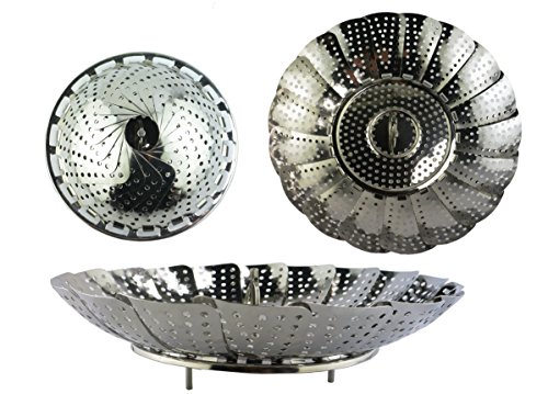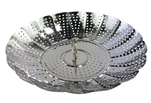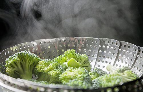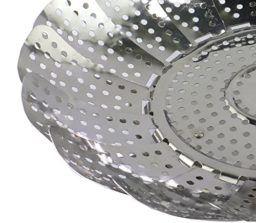 Steaming food locks in flavors and nutrients. Unlike boiling, steaming keeps flavors and nutrients in the food you're preparing instead of the water used to cook. And steaming is super healthy, too! Our steamer basket is suitable to use for all types of foods - you don't have to use it as only a vegetable steamer. Cook vegetables, desserts, seafood, meats, eggs, and more! The stainless steamer basket inserts into your existing pot or pan with extendable flaps. Separate the flaps by gently pushing them outward from the center. When food is ready, use the metal ring on the center post to carefully pull basket out of your pot. This item is made of durable stainless steel, so it is suitable for cooking. The vegetable steamer basket is also dishwasher safe, so cleanup is easy. Steamer is compact for easy storage. It fits easily in a drawer without taking up too much space. Vegetable steamer measures 5.5 inches in diameter closed and 9 inches in diameter fully extended.