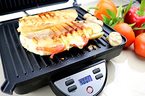 Ovente’s Stainless Steel Electric Gourmet Panini and Sandwich Maker makes grilling virtually foolproof!The 4-slice 10.2 x 9” non-stick coated plates quickly and evenly heat up your food with 1500-watts of power so there’s no need to flip it, or even watch over it. It comes equipped with a 30-minute timer with Auto Shut-Off technology when your food is ready. It also comes with an LCD display with digital temperature settings, displayed accurately between 150-425° F. The floating lid allows for versatility of foods you can grill with this handy tool. From melty grilled cheese sandwiches to juicy ribeye steaks—this grill does it all!