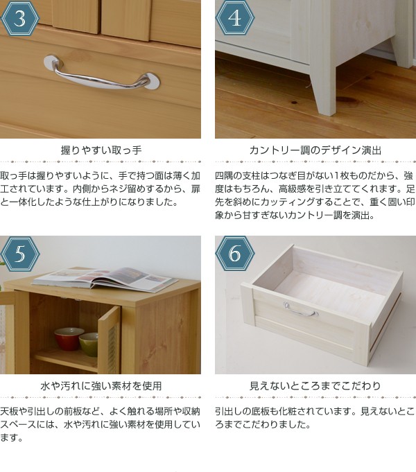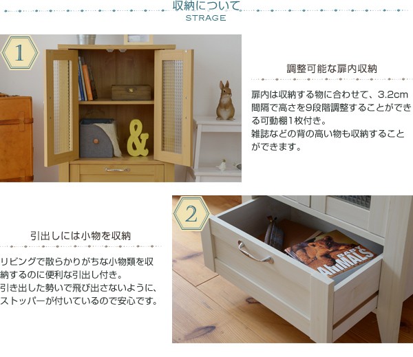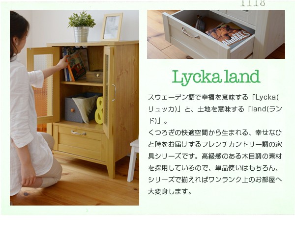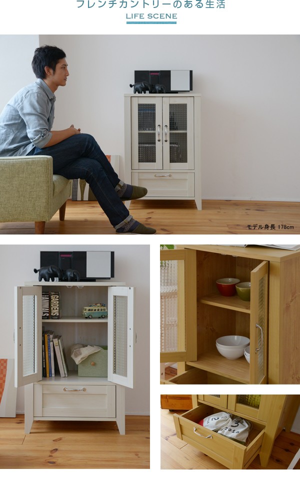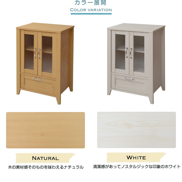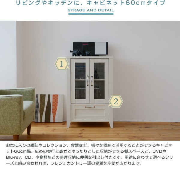 ■商品説明 木目調のシート、型板ガラスがカントリーテイストなリュッカランドシリーズ。リビングラインナップの中のキャビネット60cm幅。大きめのガラス扉収納部は、収納物が一目でわかるのはもちろん、お気に入りの小物や食器類、雑貨等をディスプレイすると、お部屋がさらに魅力的になります。見せたくないものも下段の引出しにしっかり収納していただけます。■本体サイズ [外寸]幅59.5×奥行42.5×高さ90.0cm■組立時間(目安)(大人2人) お客様組立(30分)■キーワード ガラスキャビネット リビング リビング収納 扉 フレンチカントリー スリム おしゃれ マルチ収納 収納庫 家具 インテリア 収納 棚 木製 両開き リビングキャビネット 飾棚 ホワイト 白 小型 サイドキャビネット マルチキャビネット ナチュラル