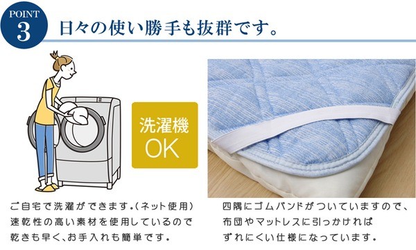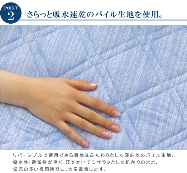 接触冷感・吸水速乾・消臭機能が特徴の商品です。こちらの商品は、両面使えるリバーシブル素材です。表地にはQ-MAX0.4以上の冷感素材を使用。裏面には柔らかな肌触りが特徴のソフト吸水速乾パイルを使用しています。中わたには機能綿「クリーンマックス」を使用。消臭・部屋干し加工などの特徴があります。エアコンが苦手な方でも快適に。節電、節約にもつながる商品です。ズレにくいよう四隅にはゴムバンド付きです。洗濯機で丸洗いが可能なので、いつでも清潔にご使用頂けます。