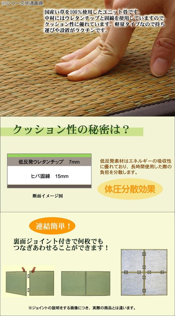 fk094igrjsユニット畳のセットです床に置くだけで和のスペースが出来上がります サイズ 82×82×2.2cm(1枚) 個装サイズ:83×83×12cm 重量 個装重量:8200g 素材・材質 表地:い草 中材:ウレタンチップ7mm、ヒバ固綿15mm 縁:PP、PE 付属品 連結用ジョイント×8 生産国 日本 軽量タイプで簡単設置 ユニット畳のセットです床に置くだけで和のスペースが出来上がります