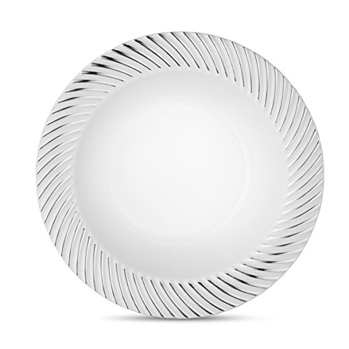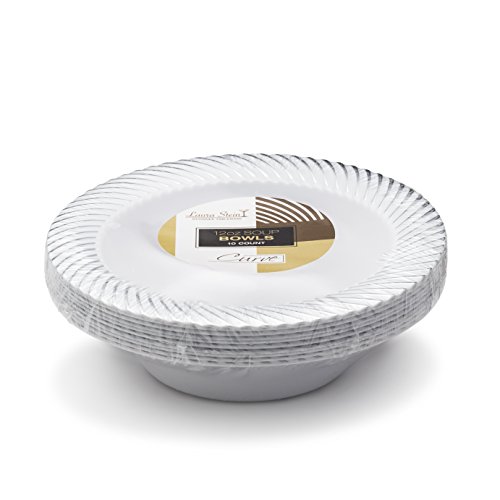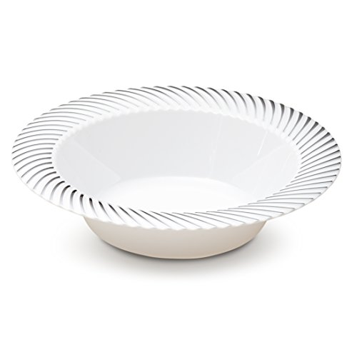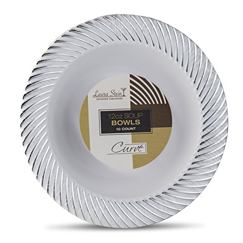 Laura Stein Designer Tableware Premium Heavyweight 12 Ounce White And Silver Rim Plastic Party & Wedding Soup Bowls Curve Series Disposable Dishes Pack of 20 Bowls