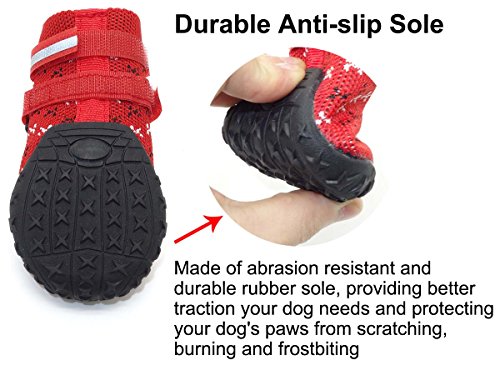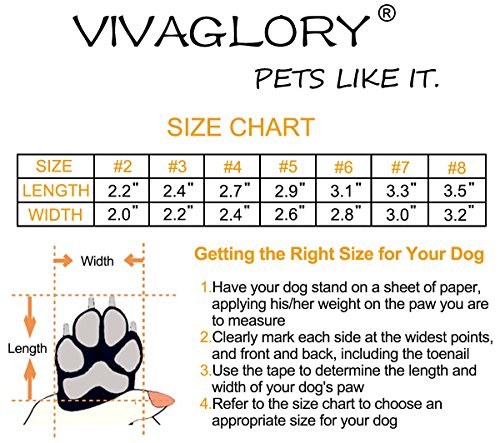 Why does your dog need the dog shoes? Dog paws are sensitive to hot pavements, cold snow, and salt-covered sidewalks. The dog shoes could keep your dog's delicate paws warm, clean and dry, and protect your dog's paws from potentially painful hot, cold, or salty surfaces. Why choose Vivaglory Dog Shoes? *Vivaglory Dog Shoes will act as a good partner for your dog; they can protect your dog's paws from hot pavement, icy surfaces and sharp objects *Made of breathable knitting material, keeps your dog's paw comfortable, clean and dry; rugged anti-slip sole provides superb traction your dog needs to stay safely mobile *Unique design with a wide split seam opening to easy put on and off; 2 long adjustable Velcro straps ensure secure fit, preventing slipping off; reflective straps also enhance your dog's visibility and safe at night *With 2 colors and 7 sizes, your dog will look fashionable How to get a right size for your dog? Step 1: Have your dog stand on a sheet of paper, applying his/her weight on the paw you are to measure Step 2: Clearly mark either side of your dog's paw at the widest points, measuring both length and width, accounting for toenails Step 3: Use the tape to determine the length and width of your dog's paw Step 4: Refer to the size chart to get an appropriate size for your dog KINDLY REMINDER: 1.If this is the first time for your dog to wear the dog shoes, please give him/her some practice to get used to wearing this dog shoes 2.Since the size of the front paws of your dog may differ from the rear paws, we provide 1 set of 2 shoes and 1 set of 4 shoes for your choice; please measure your dog's each paw individually and refer to our size chart to get an appropriate size for your dog 3.If there is any question, please contact Vivaglory Team via "Ask a question" to get a hassle-free return for a replacement or a refund 0 |