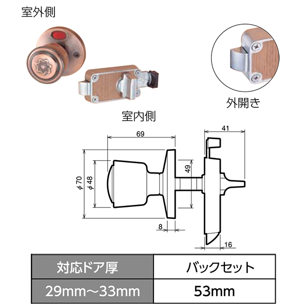 ●スペック:B/S:53mm 対応ドア厚:29~36mm 握玉外径:Φ70 ノブ部:Φ48