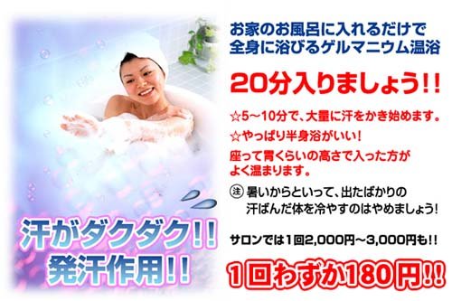 -. Feature : ゲルマ配合入浴剤でうれしいお風呂上がり。温浴効果により汗ドバ&ツル肌はそのまま! さわやかリフレッシュタイム☆ / 内容量 : 1kg
