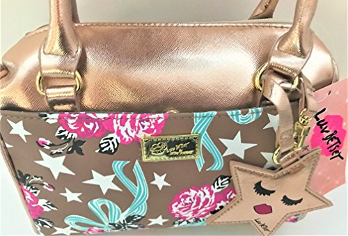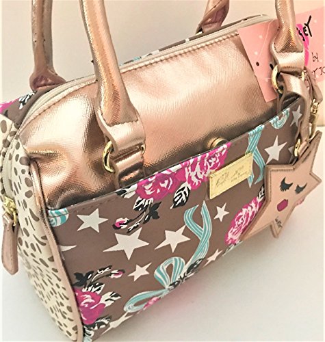 -. Feature : Luv Betsey Crossbody Mini-Barrel Satchel Purse / Rose Gold Base; Roses and stars P.R.Int (front); spot pattern (sides) / Front pocket with magnetic snap; Top zipper closure; Star-face faux leather charm; Gold logo plate / Signature Betsey dot star lining / Double rolled top handles with 6" inch drop; detachable crossbody strap: 23" drop