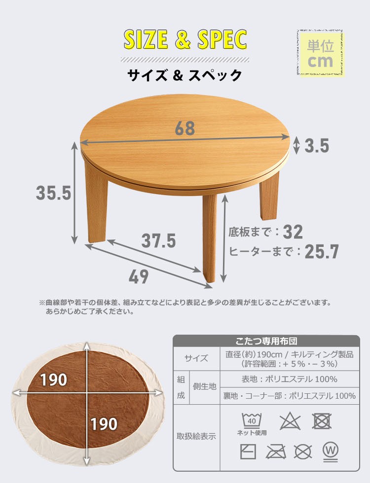 こたつ布団:直径190m(許容範囲+5%・-3%)
