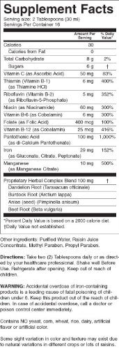 Suggested Use As a dietary supplement Take two (2) Tablespoon daily - Or as directed by your healthcare professional. hr background-color:#000;margin:0px; Supplement FactsAmount Per Serving% Daily Value***Calories30Calories from Fat0Total Carbohydrate8 gSugars6 gVitamin C50 mgThiamin (Vitamin B1) (as thiamin HCl)6 mgRiboflavin (Vitamin B2) (as Riboflavin-5-Phosphate)5 mgNiacin (as Niacinamide)60 mgVitamin B6 (as Cobalamin)6 mgFolate (as folic acid)400 mcgVitamin B12 (as cobalamin)25 mcgPantothenic Acid (as di-Calcium Pantothenate)100 mgIron (as Gluconate, Citrate, Peptonate)29 mgManganese (as Manganese Citrate)10 mgProprietary Herbal Blend Dandelion Root (Taraxacum Officinale) Burdock Root (Arctium lappa) Anise (seed) (Pimpinella anisum) Beet Root (Beta vulgaris)100 mg ***Percent Daily Values are based on a 2,000 calorie diet