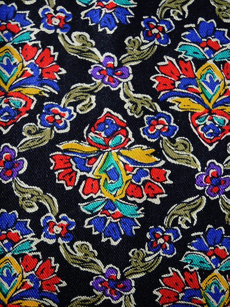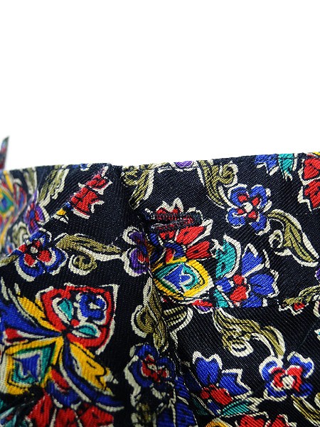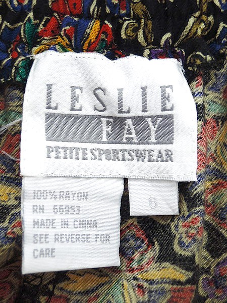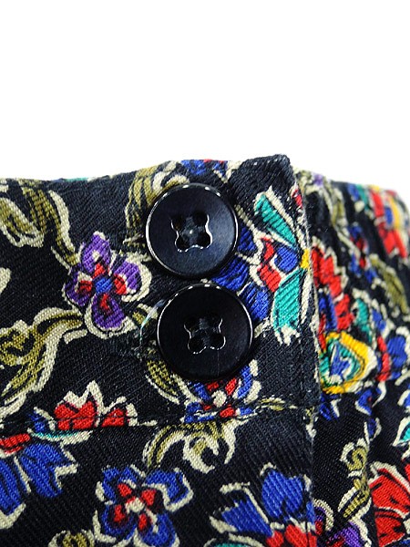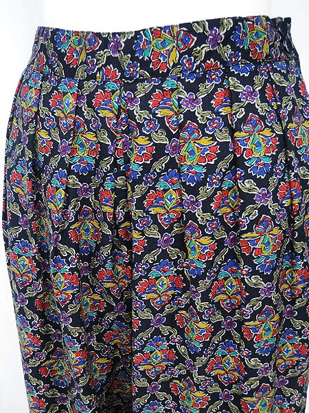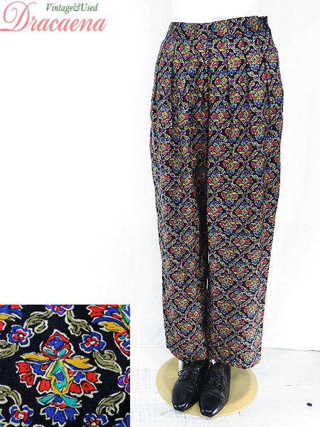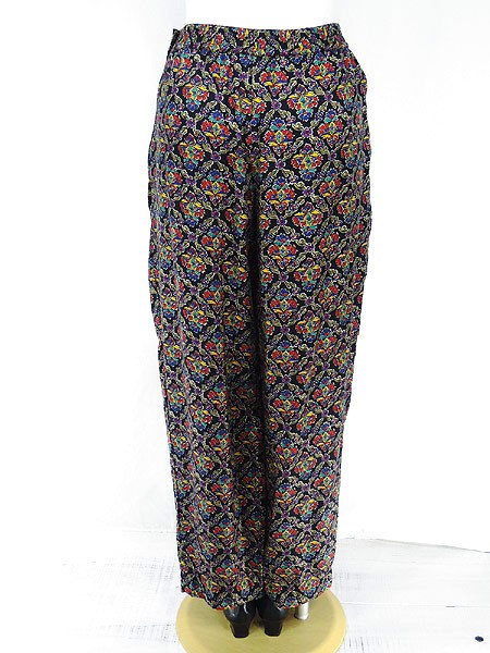 Ladies ブランド- カラー黒ベース・カラフル メール便不可 コンディション★★★ 素材レーヨン 表記サイズ6 スタッフコメント股上部分に糸引きあり。 実寸サイズ 着丈 94 cm ウエスト 66cm 〜 76cm (26インチ〜30インチ) レングス(股下) 26 インチ(66 cm) 股上 33 cm 太もも幅 34 cm 裾幅 18 cm ※ウエスト・ヒップ以外は平置き採寸