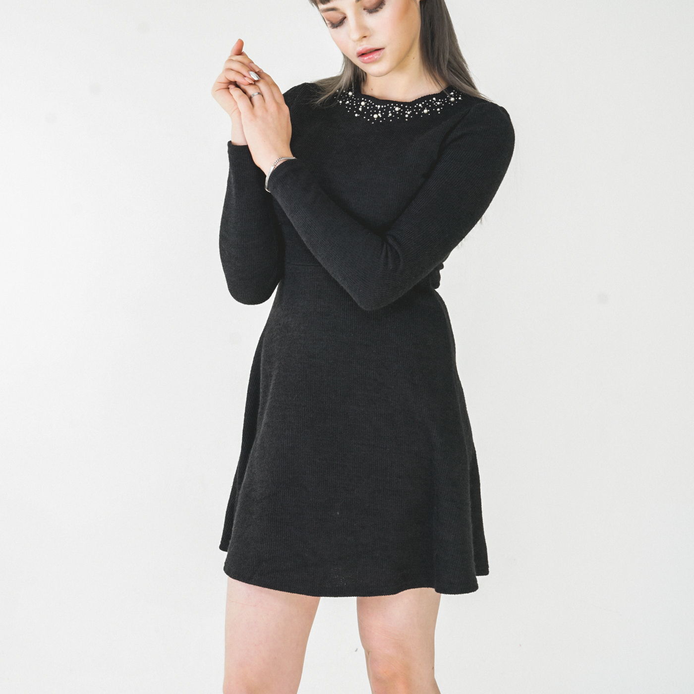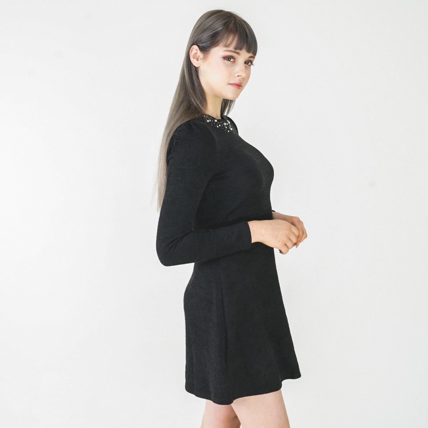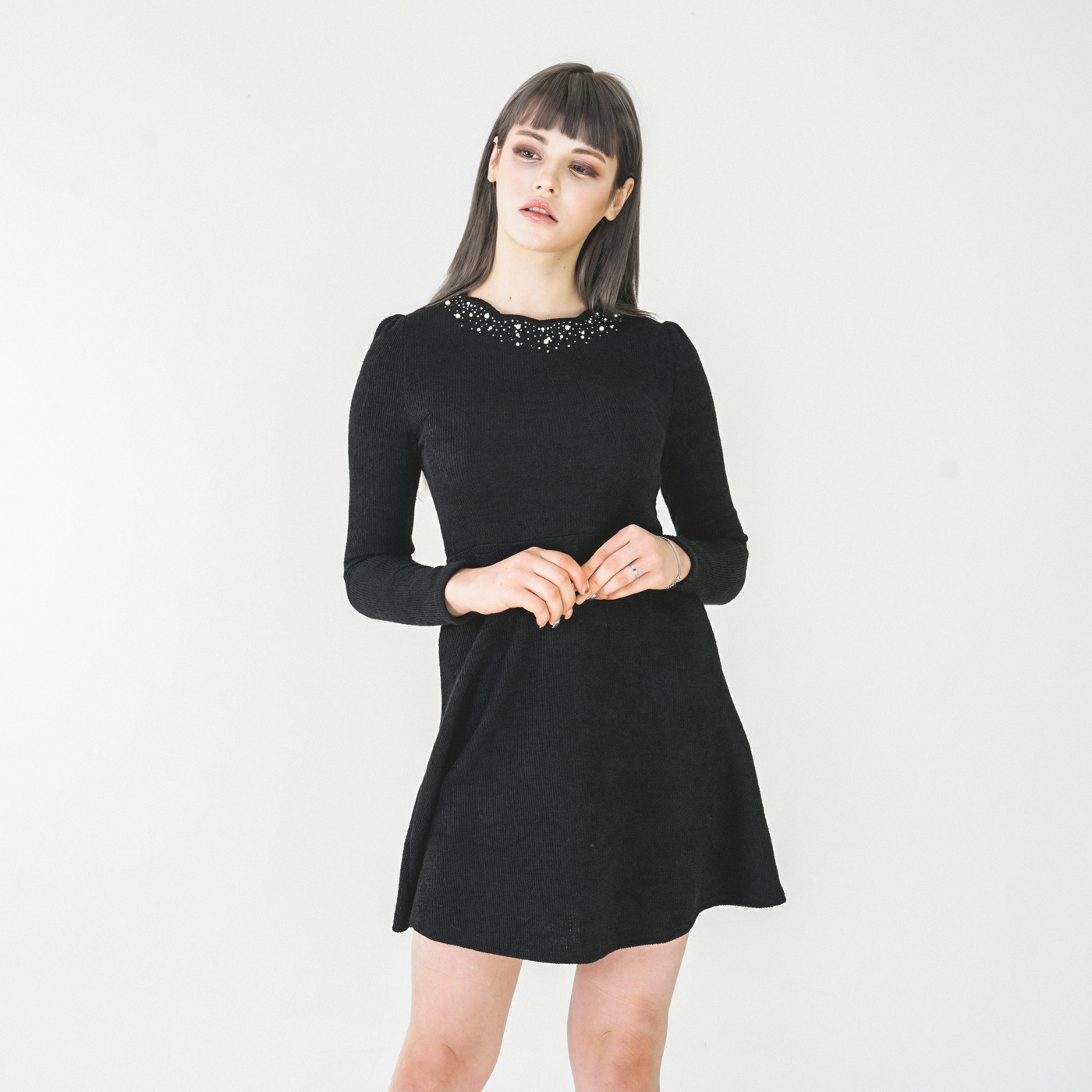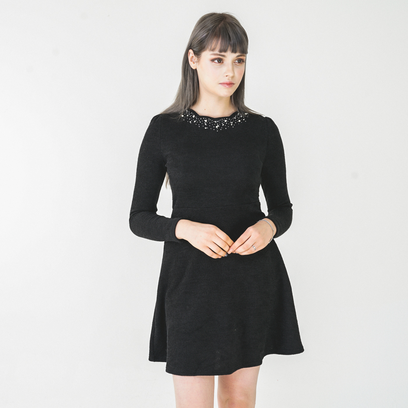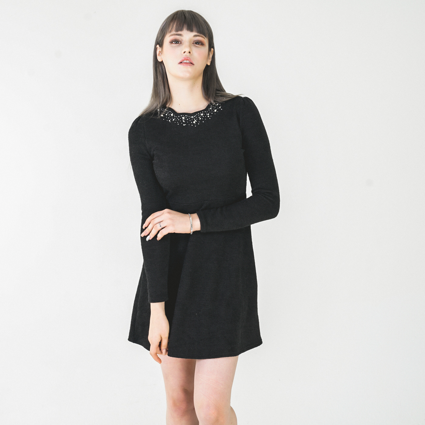 넥라인 디자인이 고급스런 니트질감의 우아한 원피스입니다.