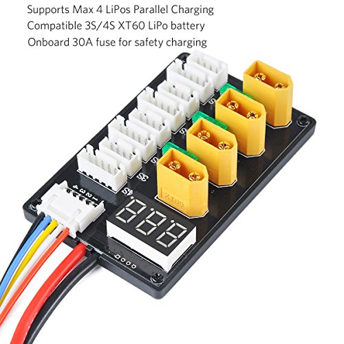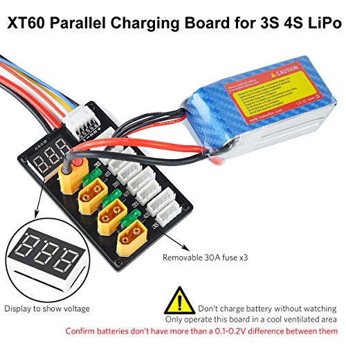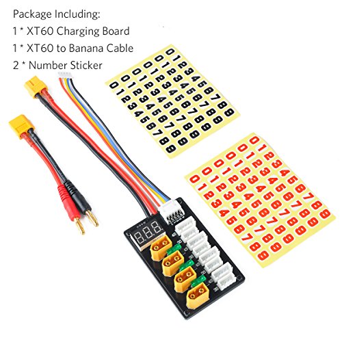 Package Including 1 * XT60 Parallel Charging Board for 3s 4s LiPo Batteries 1 * XT60 to banana Connector 2 * Number Sticker 0