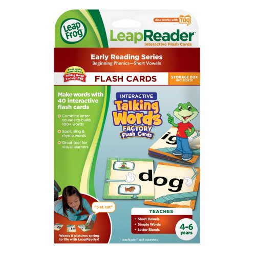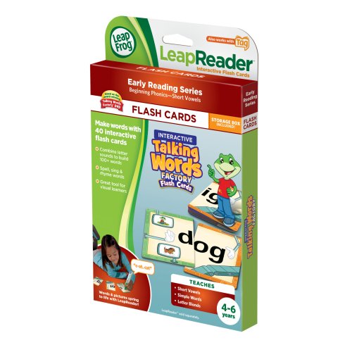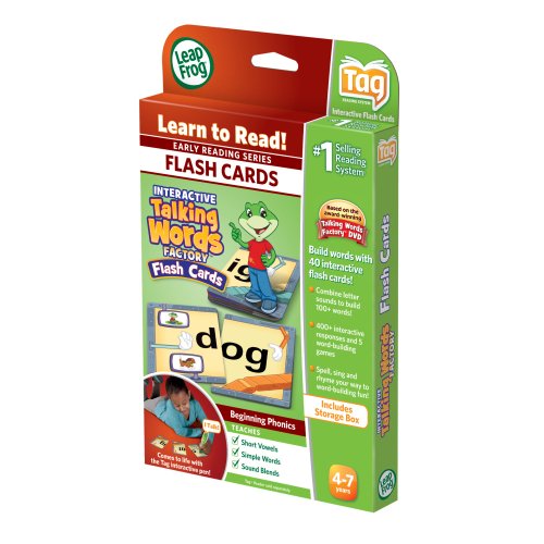 -. Binding : Toy -. Brand : LeapFrog Enterprises -. EAN : 0692000181379 -. Edition : B27CC815 -. Feature : Transform letters into words that talk with 40 interactive flash cards. / Play five fun learning games and interact with 400+ audio responses. / Teaches short vowels, simple words and sound blends. / Ages 4-6 years. / Works only with Tag Reading System and LeapReader Reading & Writing System (sold separately). -. IsAdultProduct : 0 -. ItemPartNumber : 21210 -. Label : Leapfrog -. Manufacturer : Leapfrog -. Model : 21210 -. MPN : 80-21210E -. NumberOfItems : 1 -. PackageQuantity : 1 -. PartNumber : 80-21210E -. ProductGroup : Toy -. ProductTypeName : TOYS_AND_GAMES -. Publisher : Leapfrog -. Studio : Leapfrog -. Title : LeapFrog LeapReader Interactive Talking Words Factory Flash Cards (works with Tag) -. UPC : 885630215105 -. Warranty : 90 day warranty against manufacturer defects