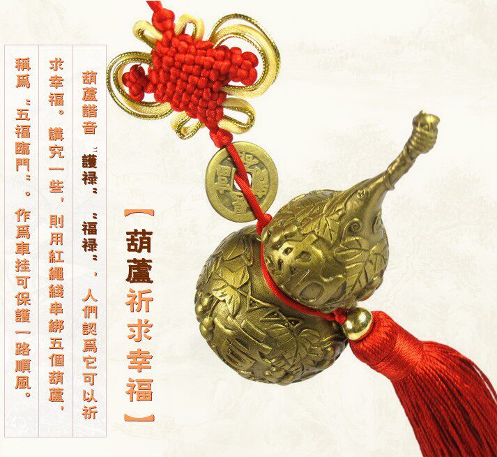 Gourd is a mascot of people loved their appearance born too weird , big mouth Tripe , human wisdom to make use of this container used to hold water , poured wine collection panacea. The Chinese nation has a special way of thinking - symbolism. Gourd " Man " and "million" homophonic , many of each gourd gourd seeds mature , people think of " future generations , lush luck ." Gourd homonym " guard Paul" " Fluke ", people think it can pray for happiness. Pay attention to some of the line with a red string tied five string gourd , known as the " Five Blessings ."