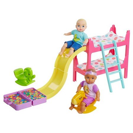 Honestly Cutes' Bunk Bed Play Room will provide hours of entertainment for your child. The set contains 14 pieces: 2 Beds, 1 Ladder 2-piece Slide, 2 Beddings Sets, 2 Rockers, 1 Ball Pit, 2 Outfits and 2 8-inch dolls one Caucasian and on Latina.Feature