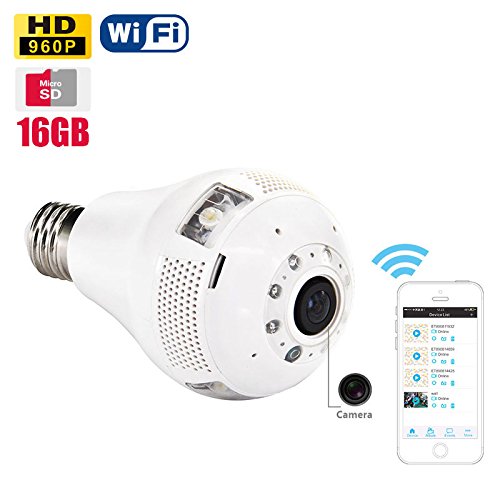 -. Title : Panorama Bulb Light WiFi Spy Camera 16GB SD Card 960P Video and Audio Recording LED Light Hidden Camera Android iPhone APP Remote Surveillance HD Spy Camera (110V only)